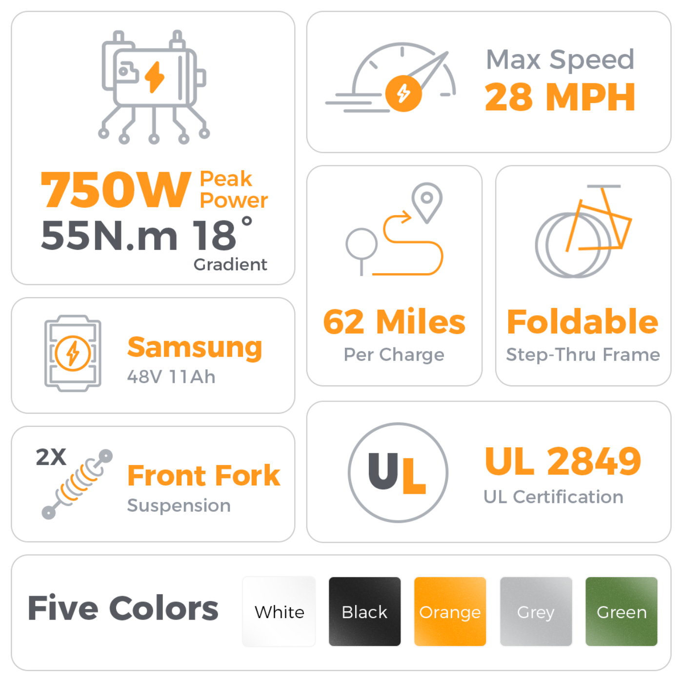 - Range: Up to 62 miles, 5 riding modes including pure electric
